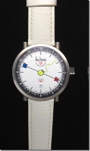 1本の針で、時間を示すピクト。チタンケースにホワイト&ブラック文字盤